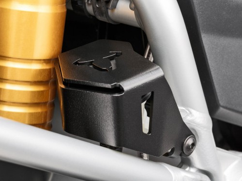 Бачок установлен в очень открытой позиции и крепится с помощью одного болта, что может привести к его повреждению или потере. Защита надежно закрывает бачок, она так же предотвращает незапланированное открытие крышки резервуара. Изготовлен из алюминия с черным порошковым покрытием.